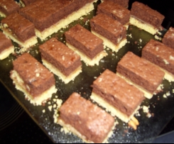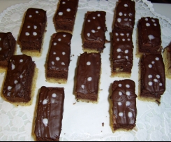Kuchen in ungefähr 6 X 3 cm große Stücke teilen, Schokoglasur schmelzen oder selber herstellen