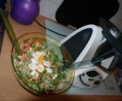 4.) Eier (evtl. kochen) Pellen, in Scheiben schneiden (wer mag, in Würfelchen, aber mir matscht das zu sehr) und mit großem Löffel, oder Finger unter den Salat heben (oder oben drauf, sieht nett aus!).