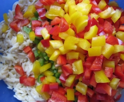 - Alle Zutaten und das Dressing vermischen. Ich lasse von dem Dressing immer erst etwas zurück und gebe evt. später noch etwas hinzu, da die Nudeln noch Flüssigkeit aufsaugen.