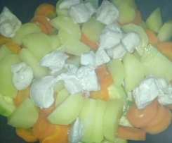 Gemüse schälen, putzen, in Scheiben schneiden und in den Varoma legen. Hähnchen kalt abwaschen, trockentupfen, in Stücke schneiden und auf das Gemüse legen. Wasser in den Mixtopf tun. Deckel drauf, Varoma drauf. 30 min Varoma Stufe 1. Dann das Wasser in einen Meßbecher abgießen. Das Gemüse und Fleisch in den Mixtopf umfüllen, ca. 60-65 ml Wasser dazugeben. 15 Sek. bei Stufe 4 pürieren.