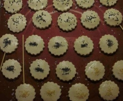 Restliche Teiglinge darauf legen, ebenfalls mit der Eiermilch bestreichen und mit Saaten belegen