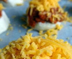 Je 1 EL Bolognesesauce darauf verteilen. Mit Käse ordentlich bestreuen. Im heißen Ofen 20–25min. backen.