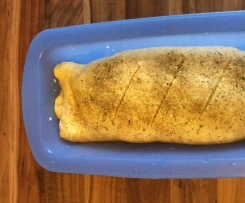 4. den Teig ausrollen (die Größe des ausgerollten 4-Ecks sollte in Etwa der Größe der Kastenform entsprechen) und mit den zerkleinerten Zutaten bestreichen, den Käse darüber verteilen und zu einer Rolle zusammenrollen. Die Brotrolle in eine Kastenform (ca 1,5 - 2 Liter) legen. Am Besten versucht man die Rolle auf die "Naht" zu legen. Das Brot einschneiden, mit Milch bestreichen und mit Kräutersalz bestreuen. Bei einer kleinere Form eventuell zwei Rollen erstellen.