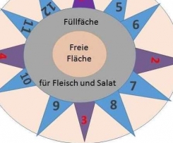 Somit legt man zuerst die Uhrzeit 12; 15; 18; 21 Uhr. Dann werden jeweils zwischen den Zeiten zwei weitere Dreiecke platziert. Die Mitte bleibt frei. Die Schnittstellen bzw. da wo sich die Dreiecke überschneiden, gehe ich nochmal mit den Teigroller rüber um eine gleichmäßige Fläche zu bekommen, die dann auch mit den Zutaten der Füllung belegt wird.