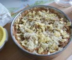 5. Auf dem gemüsebelegten Kuchen verteilen, mit der Gabel etwas ins Gemüse einarbeiten..