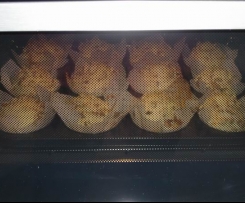 Je 1-2 EL der Masse in jedes Muffin-Förmchen füllen und mit dem verblieben Käse und den gehackten Nüssen bestreuen. Bei 200 Grad Heißluft auf mittlerer Schiene 20 Min. backen und noch 15 Min. im heißen Rohr nachwärmen lassen.