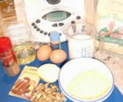 Zwiebel im Mixtopf 5 Sek / Stufe 5 hacken, Eier, Öl, Gewürze und Milch zugeben und 10 Sek / Stufe 3 mischen. Mehl mit Backpulver dazugeben und noch 1 Min / Stufe 3-4 mixen.