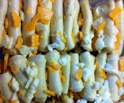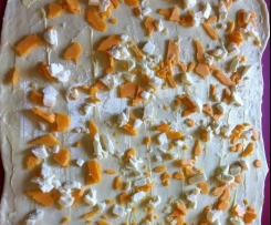 4. Cheddar und Mozzarella kurz im TM reiben und auf der Teigplatte verteilen. Knoblauch darüber reiben und und etwas schwarzer Pfeffer dazu. Wer mag, auch noch etwas Salz.