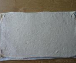 Nach der Ruhezeit wird der Hefeteig genauso groß ausgerollt wie der Blätterteig - also etwa 40 x 30 cm und wir gleich auf den Blätterteig aufgelegt und vorsichtig angedrückt.