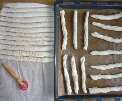 Anschließend die Teigplatte mit einem Teigrädchen in Streifen schneiden. Die Streifen halbieren, verdrehen und auf ein mit Backfolie ausgelegtes Backblech legen.