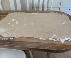 " Modus „Teig kneten“" kneten. - Den Teig auf einer gut bemehlten Unterlage zu einen etwa backblechgroßen Rechteck ausrollen.