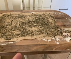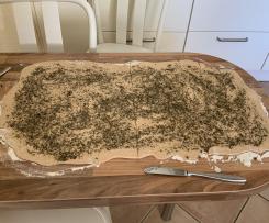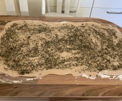 - Die Kräutermischung gleichmäßig auf der Teigplatte verteilen (am schnellsten und gleichmäßigsten klappt es mit den sauberen Händen)