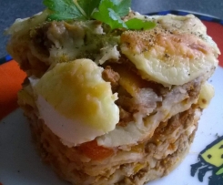 zum Schluß mit Eierscheiben belegen, mit Käse und Oregano bestreuen und im vorgeheizten Backofen 45min. überbacken.