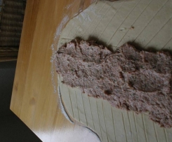 hm, das Foto hab ich gerade nicht hier aber ich versuche es nochmal zu erklären. Im Prinzip den Teig ausrollen (Länglich). Dann in 3 Teile vorsichtig teilen nicht durchschneiden, ergibt dann 3 Streifen. Der mittlere Streifen wird mit Paniermehl zuerst bestreut dann die Masse darauf. Die Seiten werden seitlich in Streifen eingeritzt, dann diese zur Mitte hin einschlagen ähnlich wie einen Zopf.