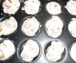 Diese aurgerollten Streifen in der Mitte "knicken" und in die gefettete Muffinform setzen.