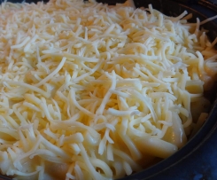 9. Nudeln samt Käsesoße auf der Bolognese verteilen, mit geriebenem Gouda bestreuen.