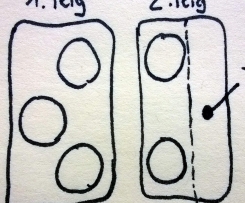 Danach zu 2 Pizzateigen in Backblechgröße ausrollen, dann aus einem 3x 15cm große Kreise ausschneiden (siehe Skizze) und aus dem anderen 2x 15cm große Kreise ausschneiden (siehe Skizze).