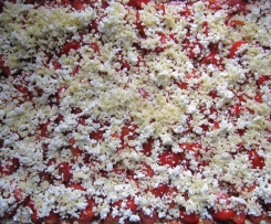 Erst den Schafskäse, dann den zerkleinerten Emmentaler über die Tomaten geben .....