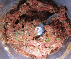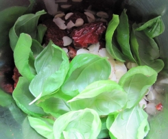 Wer mag, kann anfangs auch noch Knoblauch und etwas Parmesan mit zerkleinern und anstelle der Mandeln Pinienkerne nehmen.