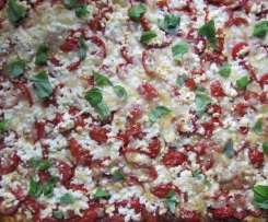 .... und die Pizza im unteren Bereich des Backofens (ich nehme die 2. Schiene von unten) ca. 25 Minuten knusprig backen. Basilikumblätter etwas zerkleinern und darüber verteilen.