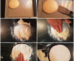 Die Teigkugeln mit den Fingern auf einer gut bemehlten Arbeitsfläche ausbreiten.( Mehl-Grieß Mischung 4-1)