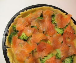 Lachs in grobe Stücke zupfen und ebenfalls auf dem Quichboden verteilen.