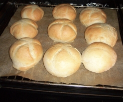 Aus den Teig in 14 gleich große Portionen teilen ,diese zu Kugeln formen und mit den Spatel ein drücken und auf dem Bleche setzen und bedeckt weitere 30 Min .gehen lassen .