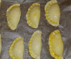 "Linkslauf" /Stufe 6 vermengen. - Teig portionsweise entnehmen und ausrollen. Ich habe die Teigfalle von Tu....ware(man kann aber auch Kreise mit einem großen Glas ausstechen) jeweils ein 1 El Füllung in die Mitte geben und zusammen falten und den Rand zusammen drücken.