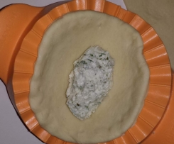 " Modus „Teig kneten“" zu einem Teig verarbeitebn. In eine Schüssel umfüllen und 40 Minuten gehen lassen. - Für die Füllung den Knoblauch in den Mixtopf geben und 5 Sek./Stufe 5 zerkleinern.
