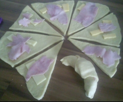 Den Käse und den Schinken (optional) auflegen und die Achtel wie zu einem Hörnchen aufrollen, die Enden bitte gut festdrücken. Dann auf ein Backblech (Backpapier) setzen, mit Eigelb bestreichen und mit dem geriebenen Käse bestreuen.