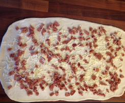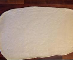 Den Teig zugedeckt 30 min. gehen lassen. Danach kurz durchkneten und zu einem dünnen Rechteck ausrollen. - Die Füllung darüberstreuen.