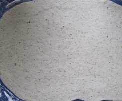 Die Arbeitsfläche etwas bemehlen und den Teig darauf ca. 50 x 35 cm ausrollen.