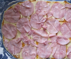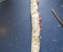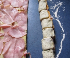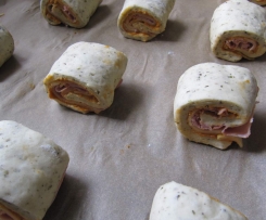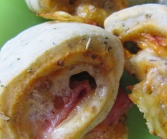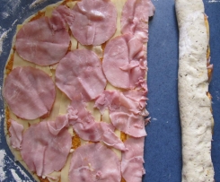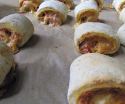 Die Idee stammt aus der Zeitschrift Chefkoch. Da wurde allerdings fertiger Pizza-Teig verwendet und dieser "nur" mit Käse und Aufschnitt belegt. Wir finden diese Snackrolls aber so leckerer.