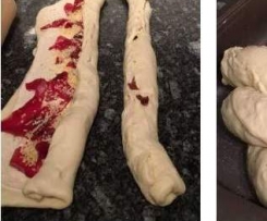 Teig auf ein wenig Mehl (ca. 40x50cm) auswallen und quer halbieren