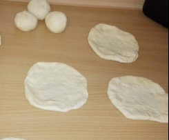 Öl in einer große Pfanne erhitzen.Teig in eine bemehlte arbeitsfläche 2-3mm ausrollen und kreise ausstechen. Oder einfach immer ein stück von Teig wegnehmen ,kleine kugeln machen und auseinander ziehen.So das es in der Mitte etwas dünn ist (sehe Foto). In heißem Öl ausbacken.