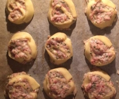 —Die Masse reicht dann für 2 Blätterteigrollen, die dann bei mir aber mindestens 30 min backen mussten.