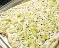 "Linkslauf" / Stufe 4 verrühren.Die Masse auf den Teig verteilen, die Zwiebelringe und nach Wunsch die Kräuter darüber streuen und im vorgeheitzten Backofen bei 200° ca. 25 Min. backen.