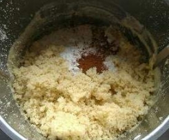 - Mehl, Backpulver, Zimt und gemahlene Mandeln in den Mixtopf geschlossen"Mixtopf geschlossen" dazugeben und 2min. / stufe 2 zu einem Teig rühren