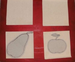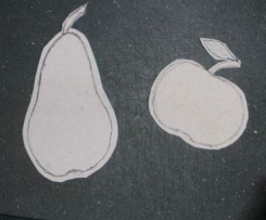 2. In der Zwischenzeit je einen Apfel und eine Birne auf eine Pappe legen. Mit einem Stift das Obst nachzeichnen und ausschneiden. Dabei sollte dIe Schablone 1 cm breiter sein, als das Obst.