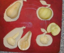5. Schablone auf den Blätterteig legen und mit den Messer oder Teigrädchen Apfel und Birne ausschneiden. Teigreste beiseite legen.
