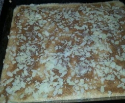 Zimt und Zucker mischen und auf dem Teig verteilen. Mandelblättchen ebenfalls auf dem Teig verteilen.