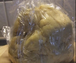 Entweder eine Pie-Form oder alternativ eine Springform Ø 26 bis 28cm "buttern" - so steht es im Original. Ich habe die Springform lediglich mit Backpapier ausgelegt. Das hat gut funktioniert. Nun wird der Teig aus dem Kühlschrank geholt und von einer Hälfte (die andere wieder zurück in den Kühlschrank) ein Platte ausgerollt, die 1-2 cm über den Rand steht, damit man diesen innen am Formrand anlegen kann (sonst läuft später die Flüssigkeit der Füllung raus). Je nach Equipment unbedingt Nudelholz und Untergrund mit Mehl bestäuben - bei meiner alten Ausrüstung hat es ziemlich geklebt!