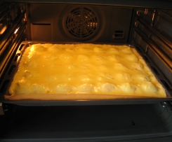 Fettpfanne (tiefes Backblech) wenig fetten und mit Backpapier belegen. Teig drauf geben und mit bemehlten Händen auf dem Blech verteilen und  einen Rand hochdrücken. Äpfel halbieren ,entkernen , schälen und dann auf das Backblech mit der Wölbung nach oben legen. Nun die Äpfel immer eng aneinander legen und zum Schluss 3-4x einschlitzen. Aus Sahne, Zucker, Puddingplv. nach alt bekannter Weise einen Pudding kochen und dann gleichmäßig über die Äpfel gießen.