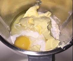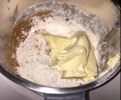 "Mixtopf geschlossen" geben & 20sec. Stufe 5 verrühren. Den Teig auf ein gefettetes Blech geben und mit bemehlten Händen verteilen. - Alle Zutaten für die Streusel einwiegen & alles 15 sec. Stufe 5 vermengen. Danach alles in eine Schüssel umfüllen.