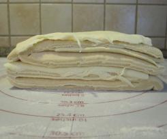 Den Blätterteig auf den ausgerollten Hefeteig legen. Mit einem Pizzaroller halbieren und wieder aufeinanderlegen. Dieses noch 2 mal wiederholen. Die 2 Teige sind jetzt abwechselnd geschichtet (siehe Bild oben links).
