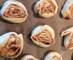6. Auf einer bemehlten Fläche den Teig zu einem Rechteck ausrollen und die Apfelmasse darauf verteilen. Den Teig von der schmalen Seite her aufrollen. Die Rolle in ca. 10 - 12 Scheien schneiden und auf ein mit Backpapier ausgelegtes Backblech legen. Nochmals 20 Min. Gehen lassen. Mit Milch bepinseln.