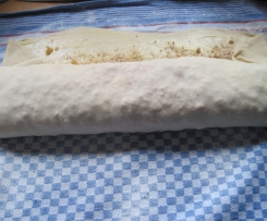 Die Seitenteile des Teiges nach innen klappen und den Teig mit Hilfe des Tuches zu einer Rolle formen, das freie obere Ende des Teiges nochmals mit Gee einstreichen und über die Teigrolle ziehen. Mit Hilfe des Tuches kann man dann den Strudel auf das gefettete Backblech transportieren.