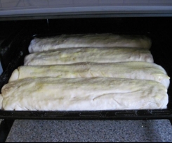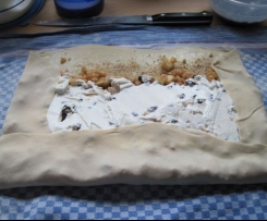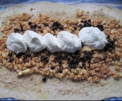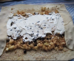 "Mixtopf geschlossen" und 1 EL Vanillezucker dazugeben, 10-15 sek. Stufe 5 rühren.Aus dem Teig 4 Teile machen. Auf einem bemehlten Tuch jeweils dünn ausrollen und an den Rändern vorsichtig ziehen, bis der Teig fast durchsichtig ist. Gee auf den Teig streichen, Mandeln draufstreuen, dabei achten, dass das obere Ende des Teiges ohne Mandeln bleibt, 1/4 der Äpfel darauf verteilen, nach Geschmack mit Zimt-Zucker bestreuen. Je nach Geschmack die Rosinen darauf verteilen, einige EL der Quarkmasse darüber streichen.