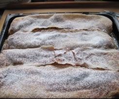 Wenn alle vier Strudel auf diese Weise auf dem Backblech liegen, nochmals Gee darüber streichen. Den Ofen auf 180° vorheizen und die Strudel ca. 40 Minuten backen. Danach mit Puderzucker bestäuben und noch warm servieren.