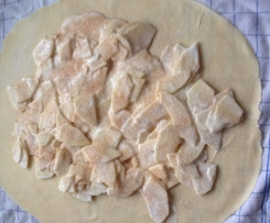 "Mixtopf geschlossen" geben und 30 Sek. Stufe 4 verrühren. In eine Schüssel umfüllen. Äpfel schälen und sehr fein hobeln. Ich nehme den Gurkenhobel dazu. Zu der Masse geben und unterrühren. - Den ersten Teig nehmen und auf ein sehr gut bemeltes Geschirrtuch legen und sehr dünn ausrollen. Man sollte das Muster des Geschirrtuches darunter erkennen können. Nun 1/3 der Quark-Apfelmasse draufgeben und ca. 1 cm rundherum am Rand freilassen. Mit Zimtzucker bestreuen.